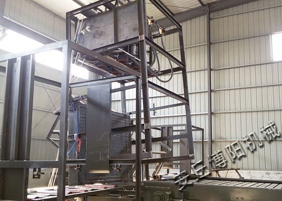 工作时,用铲车将整齐码好袋子的垛盘放到存垛输送机上,存垛输送机向前运动,垛盘自动进入托盘部装的托盘上。然后油缸动作,活塞杆伸出,链板输送部装连同托盘部装慢慢倾斜至设定角度(此角度根据生产实际加以调整),链板输送部装连同托盘部装向上运动至设定位置。