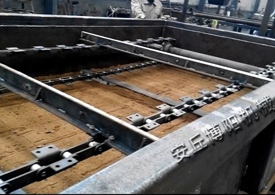 刮板输送机的工作原理是,将敞开的溜槽,作为煤炭、矸石或物料等的承受件,将刮板固定在链条上(组成刮板链),作为牵引构件。当机头传动部启动后,带动机头轴上的链轮旋转,使刮板链循环运行带动物料沿着溜槽移动,直至到机头部卸载。刮板链绕过链轮作无级闭合循环运行,完成物料的输送。