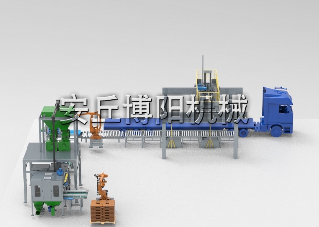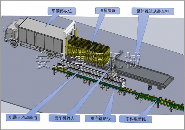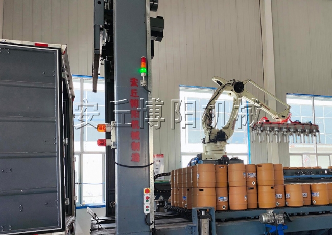 集装箱全自动装车机解决方案:用于桶装、袋装、纸箱等的码垛装车,应用车型:平板、集装箱、货柜等。