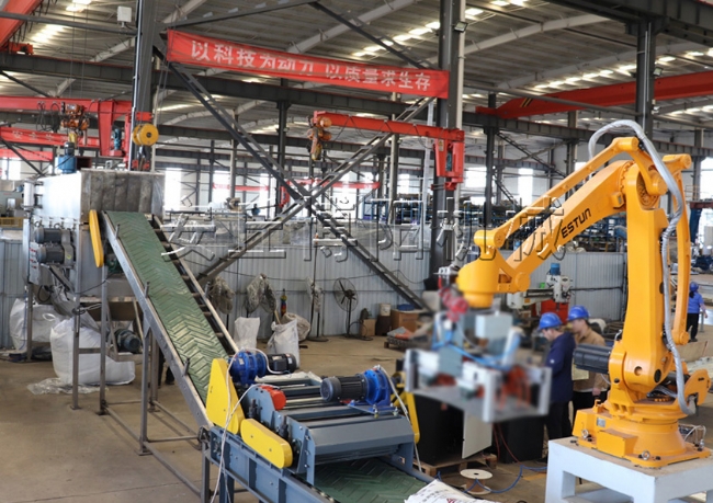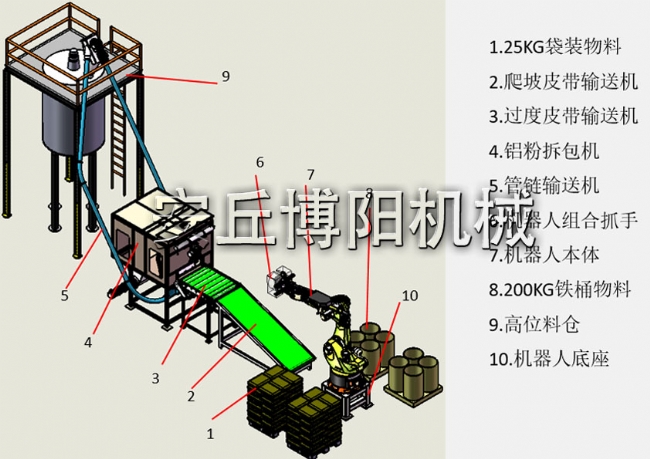 桶装铝粉拆垛机器人+自动拆包机+管链输送机上料系统